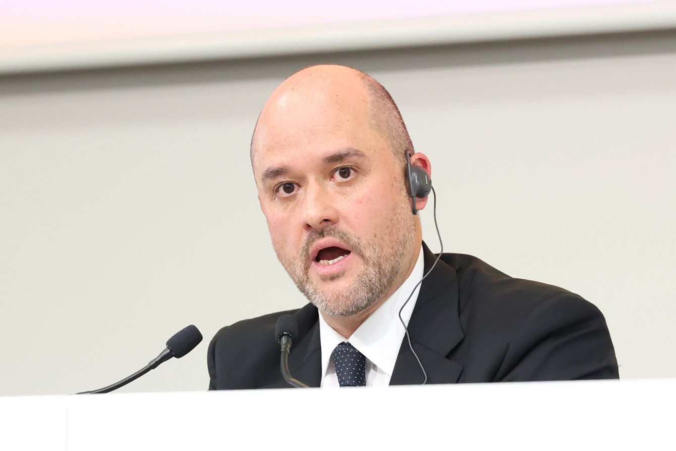 日産自動車、2024年度決算説明会。写真は、質問に応じるイバン・エスピノーサ社長兼CEO=2025年5月13日、横浜市西区