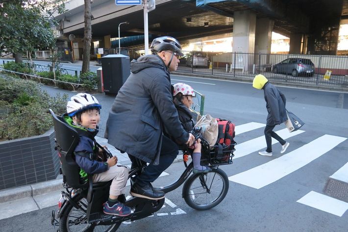 2人の子どもを自転車に乗せる筆者。自分だけでなく子どもにもヘルメットをかぶせている