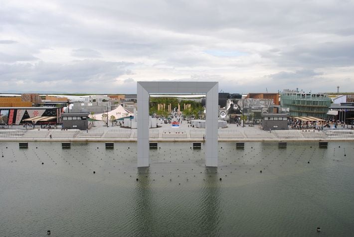 アーチと「七つの美」の像が来場者を迎えるアゼルバイジャン館の入り口