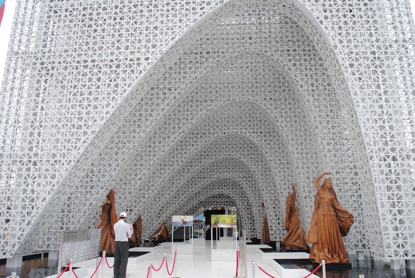 アーチと「七つの美」の像が来場者を迎えるアゼルバイジャン館の入り口