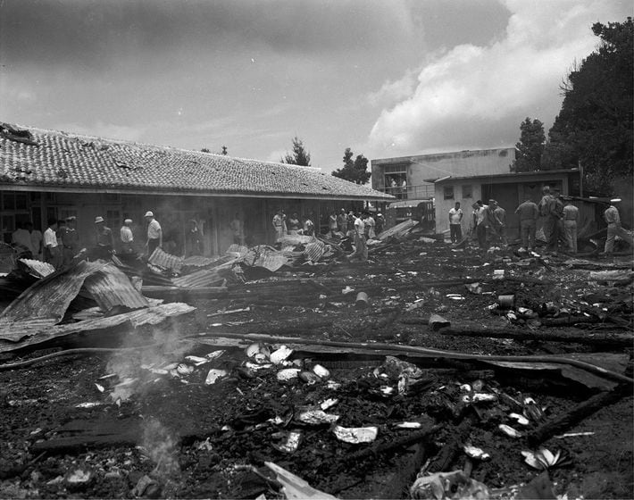 米軍嘉手納基地所属のF100Dジェット戦闘機が墜落した宮森小学校の事故現場
