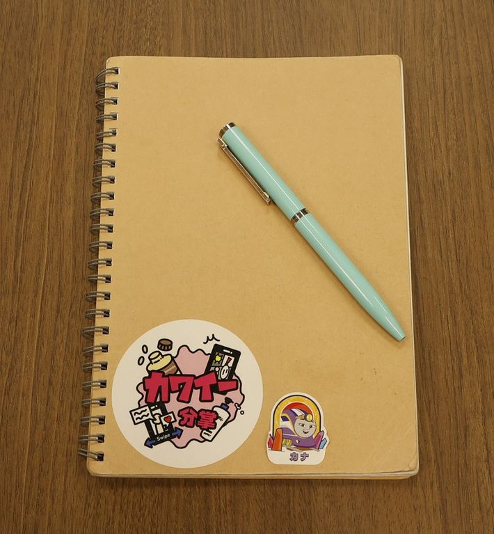 手放せない仕事道具:役員昇格時にもらったペン、アイデアメモ用のノート、河合チームのオリジナルシールも