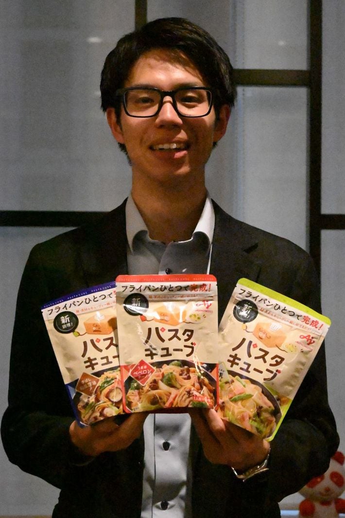 味の素・食品事業本部の長谷駿佑さん。大学時代はうどんを自ら打ったり、好きなインスタント食品の味を再現したり、アルバイト先の飲食店で新メニューを提案したりと、食への探求心を持ち続けてきたという。