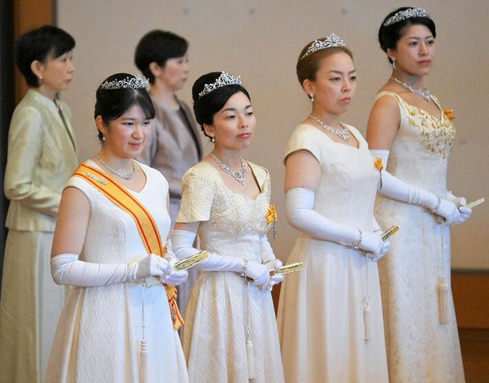 「新年祝賀の儀」に臨まれる天皇、皇后両陛下の長女愛子さま、三笠宮家の長女彬子さま、次女瑶子さま、高円宮家の長女承子さま=2024年1月1日、宮殿・松の間