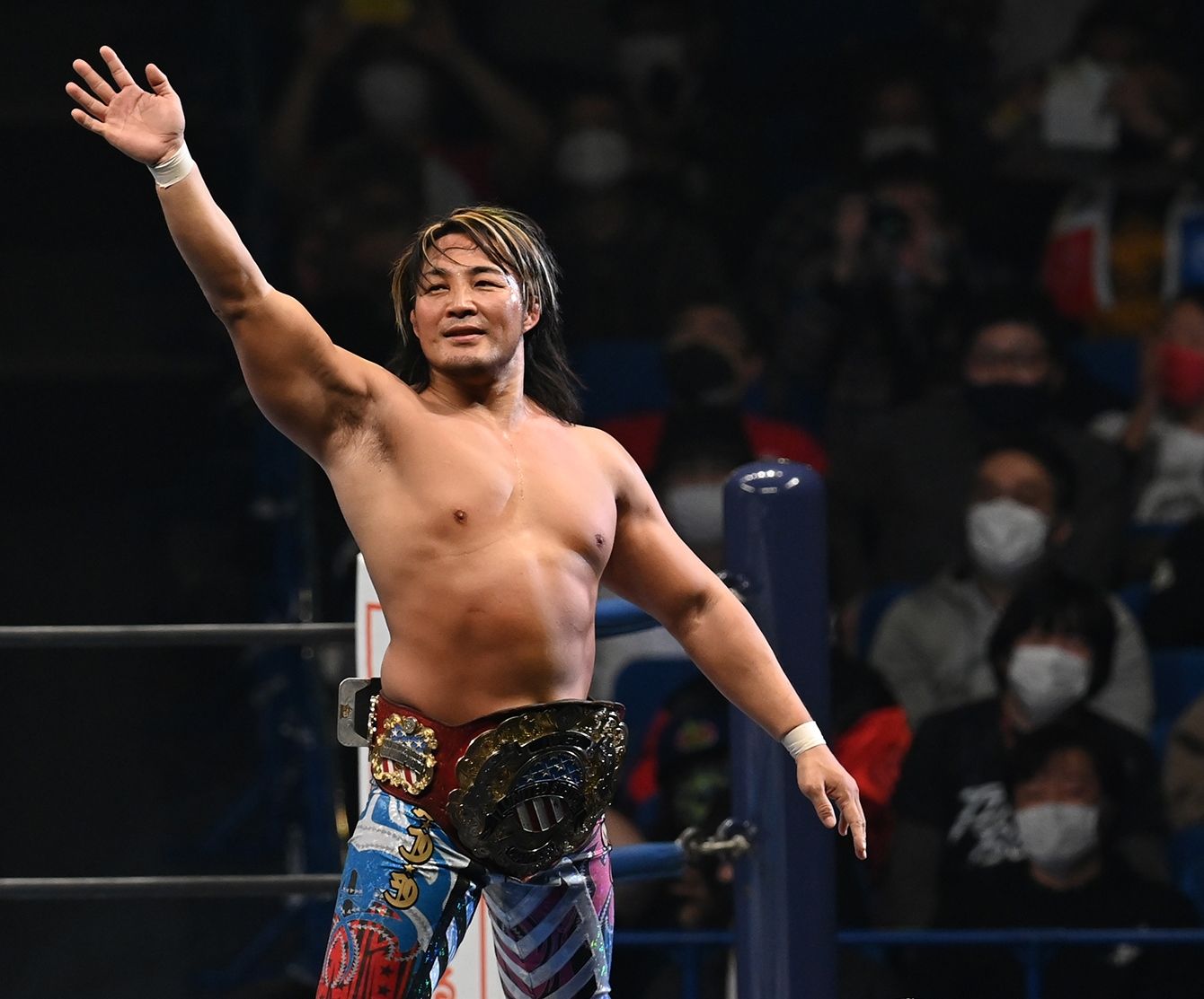 横浜アリーナでファンの声援に応える棚橋弘至=2022年1月8日、横浜アリーナ