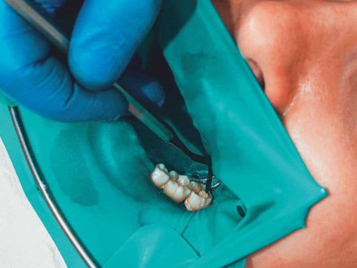 ラバーダム治療のイメージ。治療する歯以外をゴムシートで覆うことで、細菌が患部に入り込むことを防ぐ。