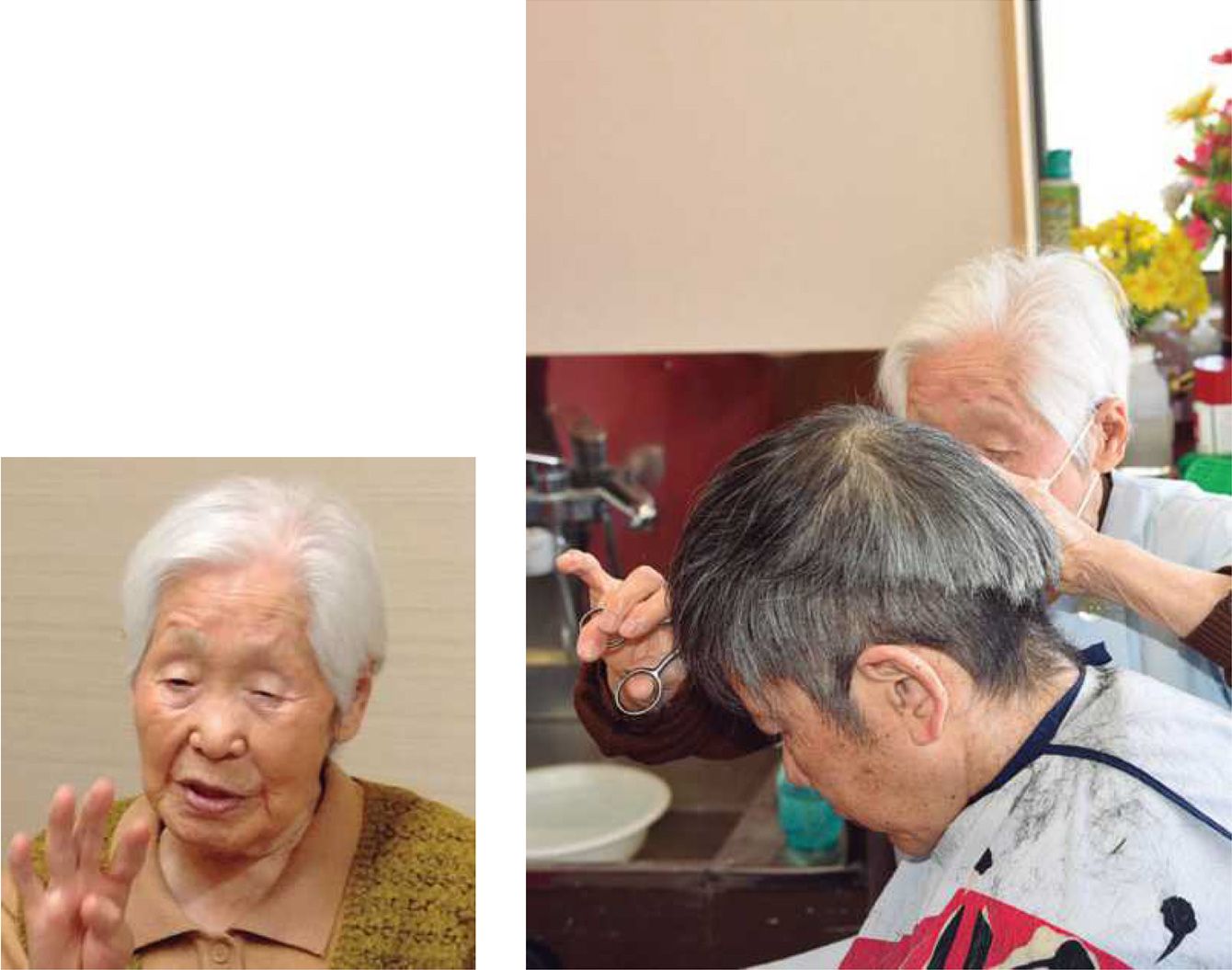 90年以上愛用する鉄製の重いハサミで、常連客の髪を切る箱石シツイさん(右。写真提供=箱石英政氏)。人生のモットーは「ひるまず・うらやましがらず・あらそわず」だ。