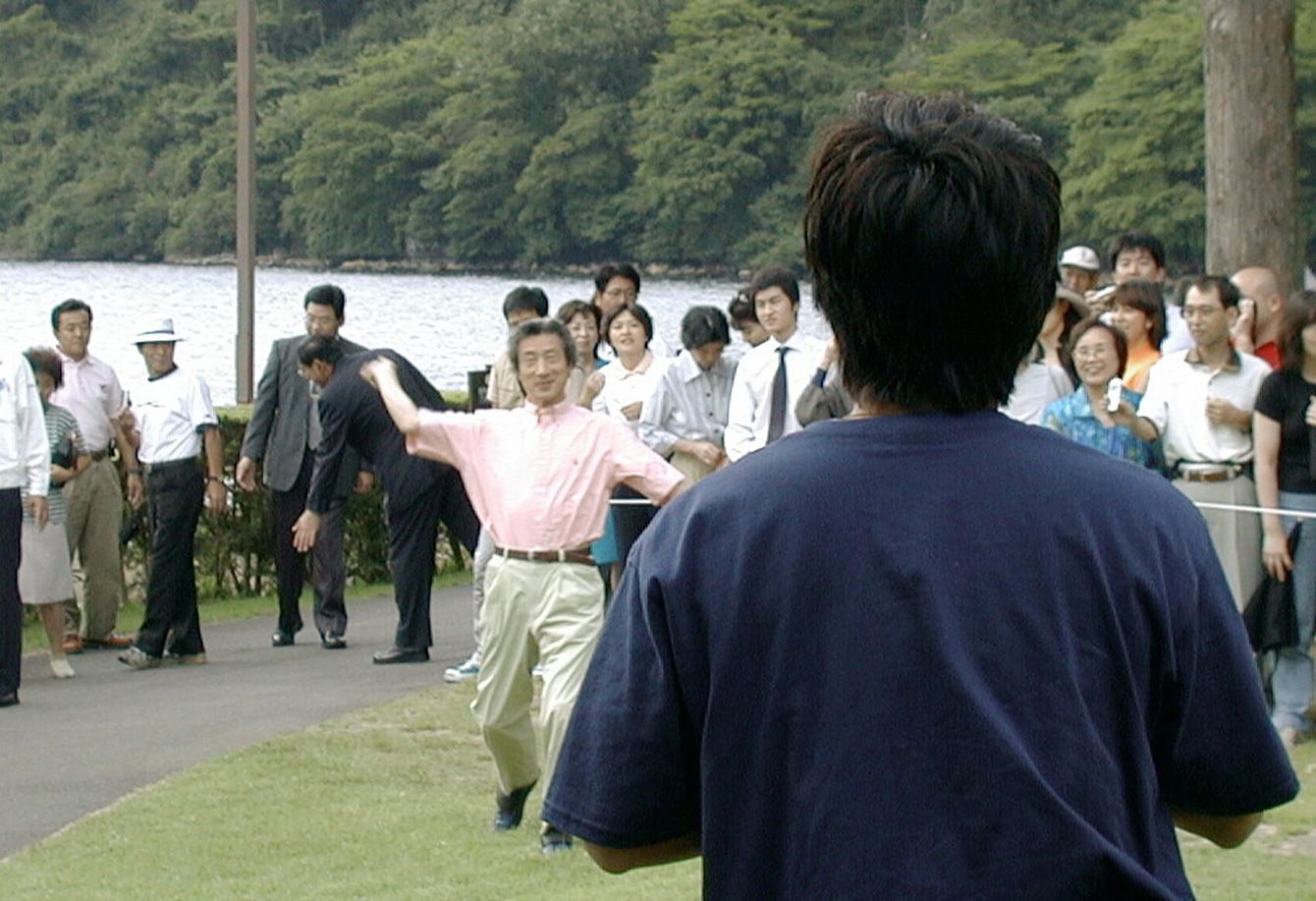 静養先の箱根で次男の進次郎さん(現農水相)とキャッチボールする小泉純一郎首相(当時、2001年8月)。多忙な中でも親子関係を重視した。