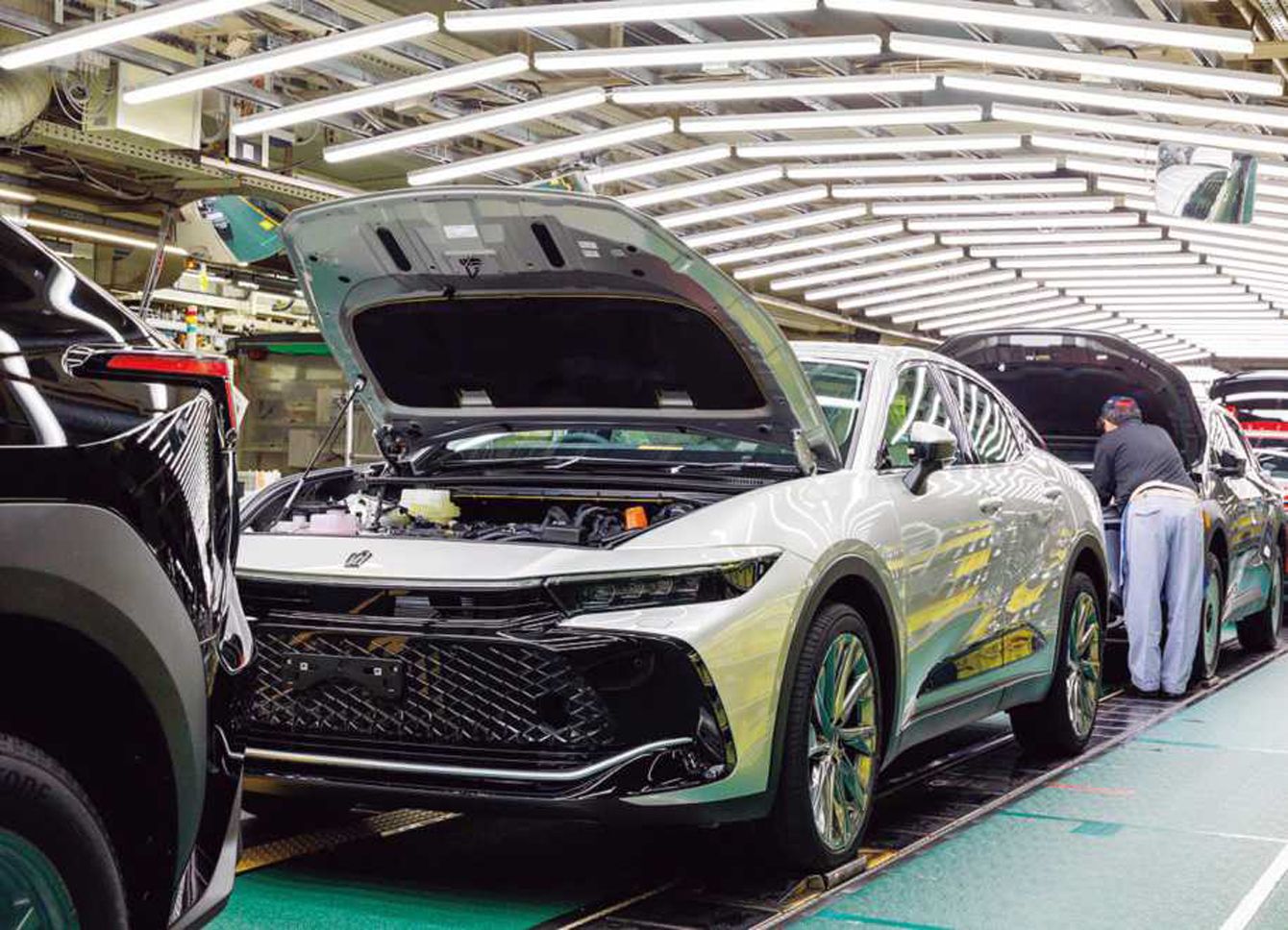 元町工場の組み立て生産ライン。前後で違う車種が流れてきたとしても、担当者は作業のテンポを一切乱すことなく、ムダのない動きで部品を取り付けていく。