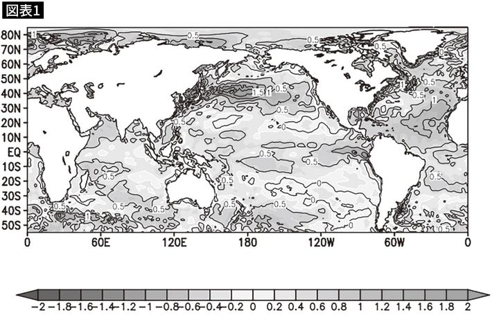 2023~2024年の2年間を平均した、世界の海面水温の平年からの差。濃い色は全て平年よりも高温を示す(気象庁の海面水温データを用いて作図)。『