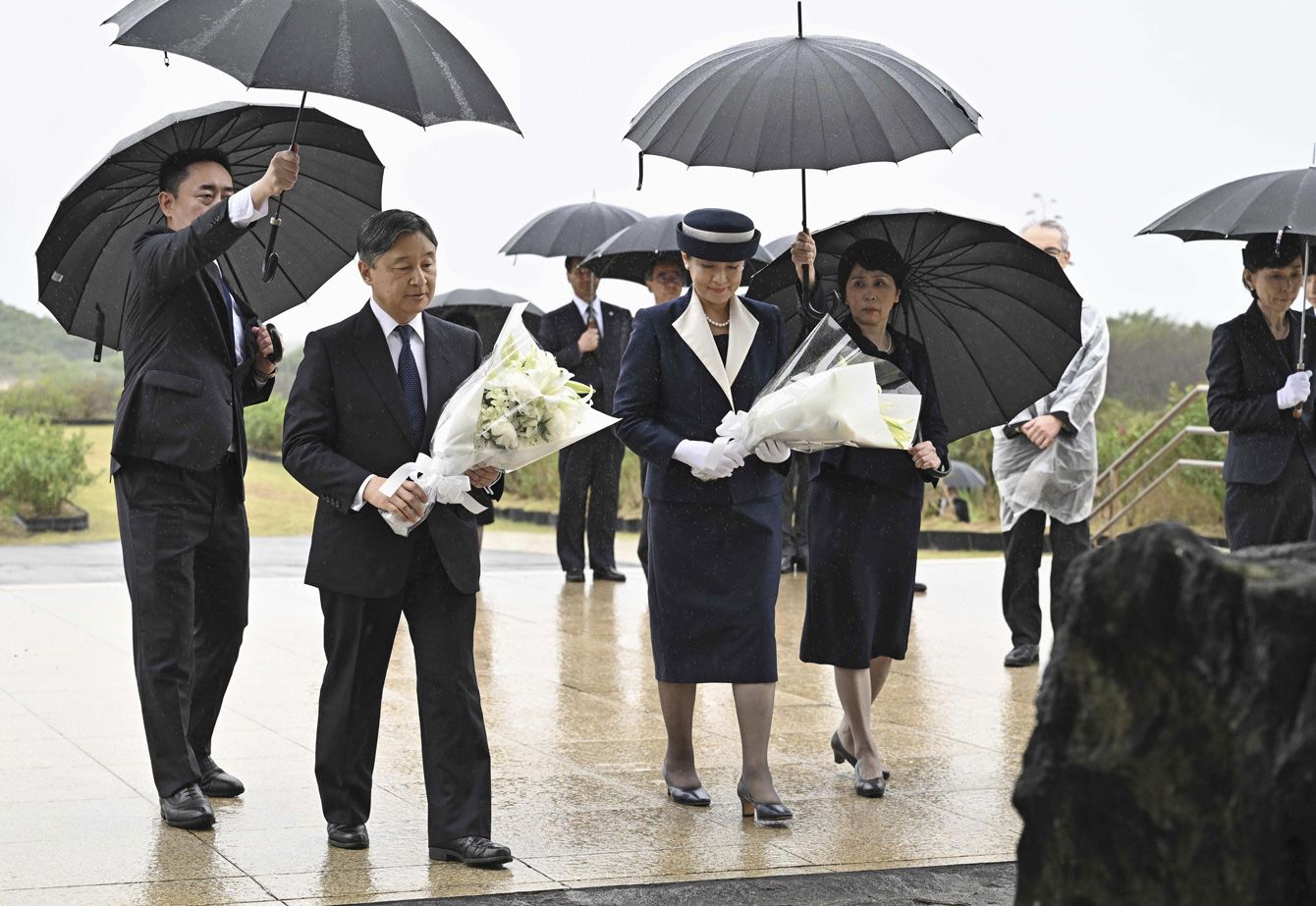 太平洋戦争の激戦地・硫黄島で、旧日本軍の最後の拠点だった天山壕の上に造られた「天山慰霊碑」(硫黄島戦没者の碑)に献花される天皇、皇后両陛下=2025年4月7日午後、東京都小笠原村