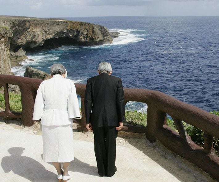 サイパンのバンザイクリフを訪れ、黙とうされる天皇、皇后両陛下(当時)=2005年6月