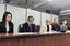 記者会見する朝日出版社の小川洋一郎社長(右から2人目)と代理人の河合弘之弁護士(中央)=2025年2月18日午前、東京・霞が関