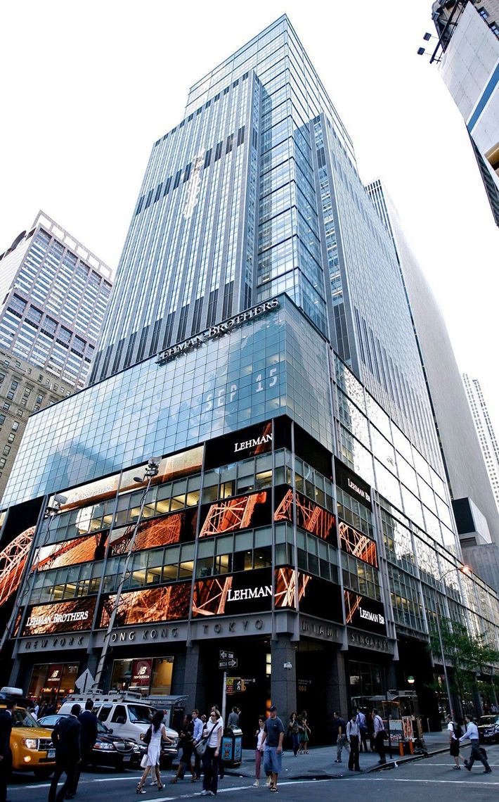 2008年9月15日、経営破綻から一夜明けたリーマン・ブラザーズ本社。同社の経営破綻を受け、ダウ平均は前週末終値比504.48ドル(4.4%)安の1万0917.51ドルと2006年7月以来、2年2カ月ぶりの安値引けとなった(アメリカ・ニューヨーク)