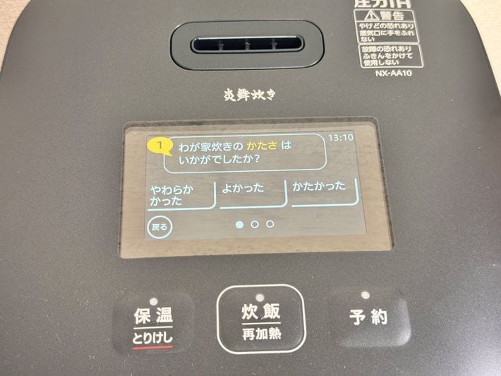 象印の「わが家炊き」の設定画面。アンケートにタッチで答えていくだけで好みに設定できる