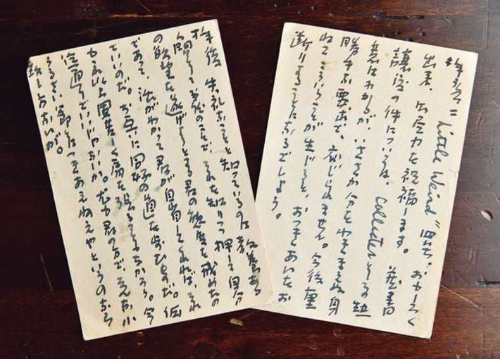 師匠の平井氏からの葉書。破門を宣告されたが(右)、詫びたところ、許すという返事(左)をもらった。
