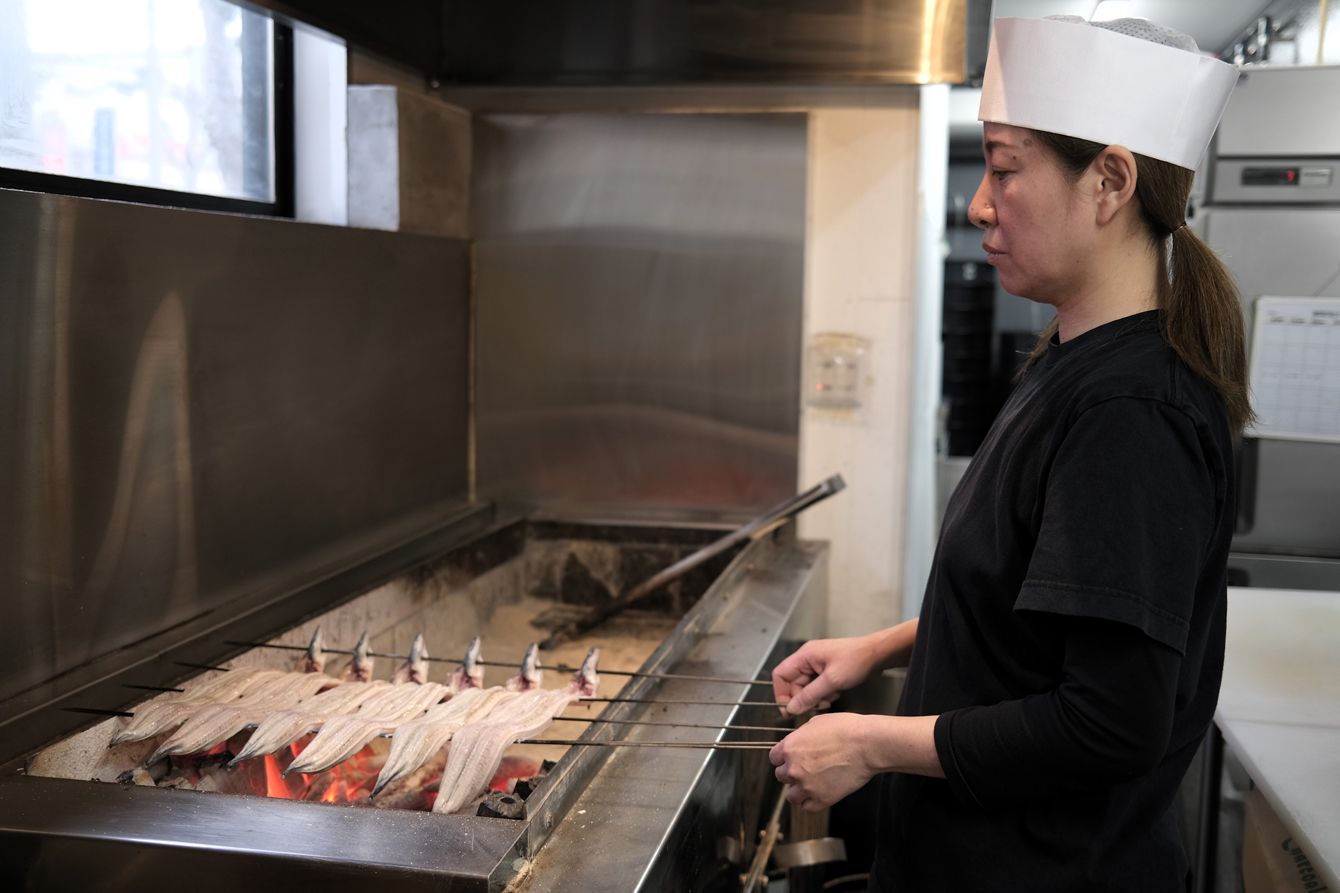 焼き場に立つ上田さん。この仕事に就くまでは魚をさばいたこともなかった