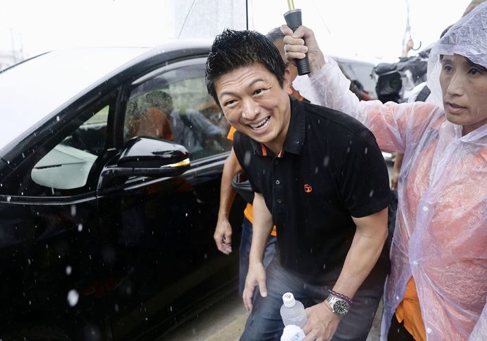 街頭演説を終え移動する参政党の神谷宗幣代表、2025年7月17日、滋賀県米原市