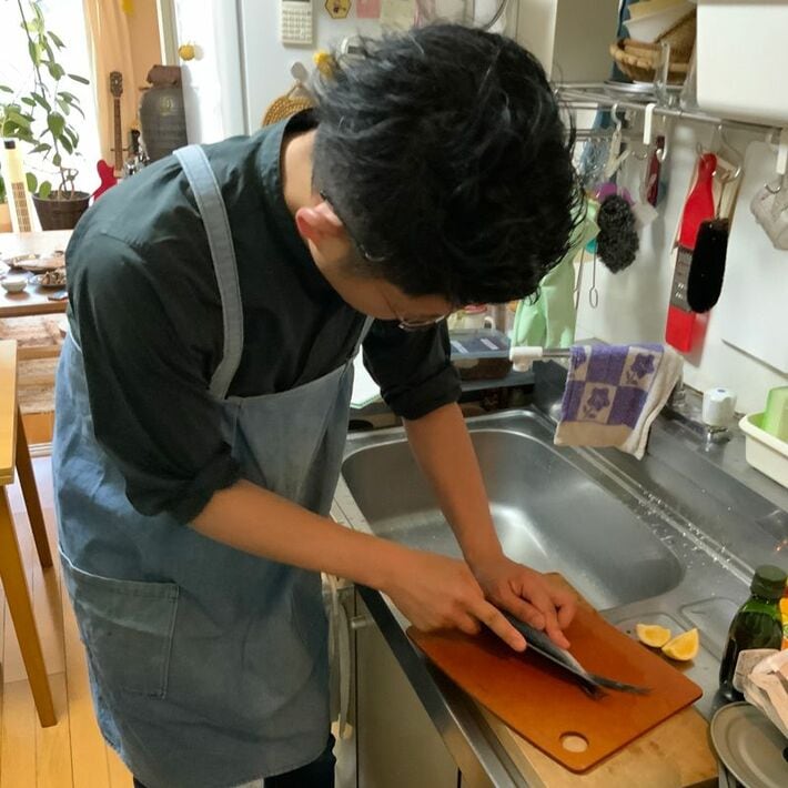 知人夫妻宅の台所でトビウオを3枚に下ろしている筆者(知人撮影)
