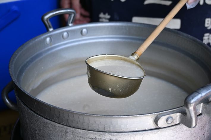 店先で販売している大鍋の甘酒。1杯350円。コロナ禍前はお正月のみだったが、雨の日以外常設されている。