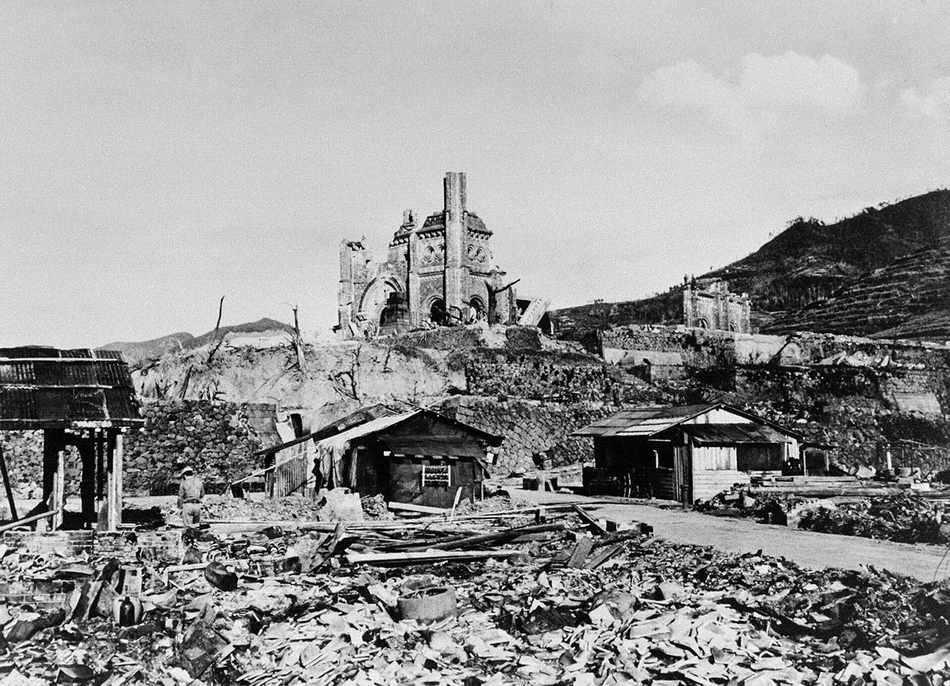 原爆投下で破壊された長崎市の浦上天主堂=1945年12月