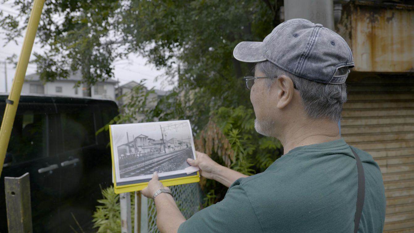 当時の現場検証写真を示しながら説明する山崎さん。JR東海道線の線路とその奥にあったのが味噌工場。