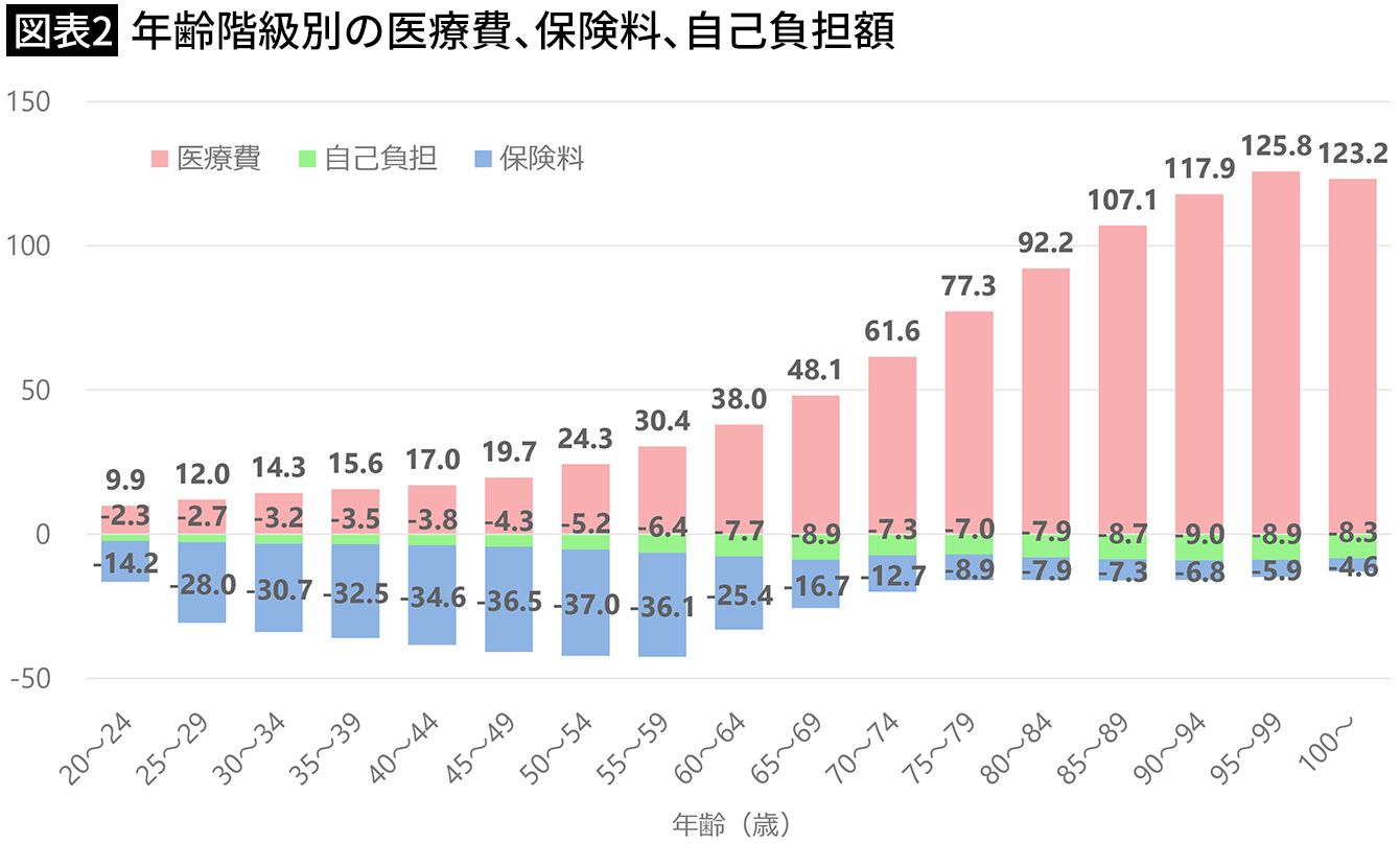 出典=「年齢階級別1人当たり医療費、自己負担額及び保険料の比較(年額)」(令和4年度 「医療保険に関する基礎資料」厚生労働省)をもとに筆者作成