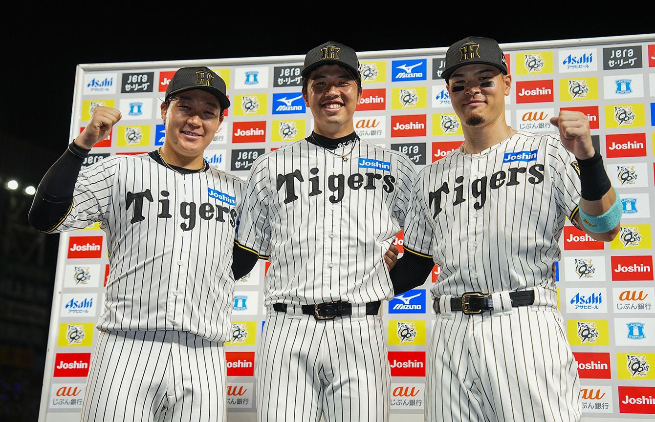 お立ち台でポーズをとる阪神の(左から)大山、才木、佐藤輝=2025年7月26日、甲子園