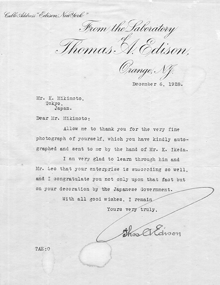 エディソンから御木本幸吉に送られた手紙
