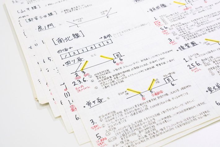 最初に作った手書きノートは「わかりにくい」と却下され、横軸を車両、縦軸を駅名にして、色分けしてすべて作り直した。今の「のりかえ便利マップ」とほぼ同じ構成