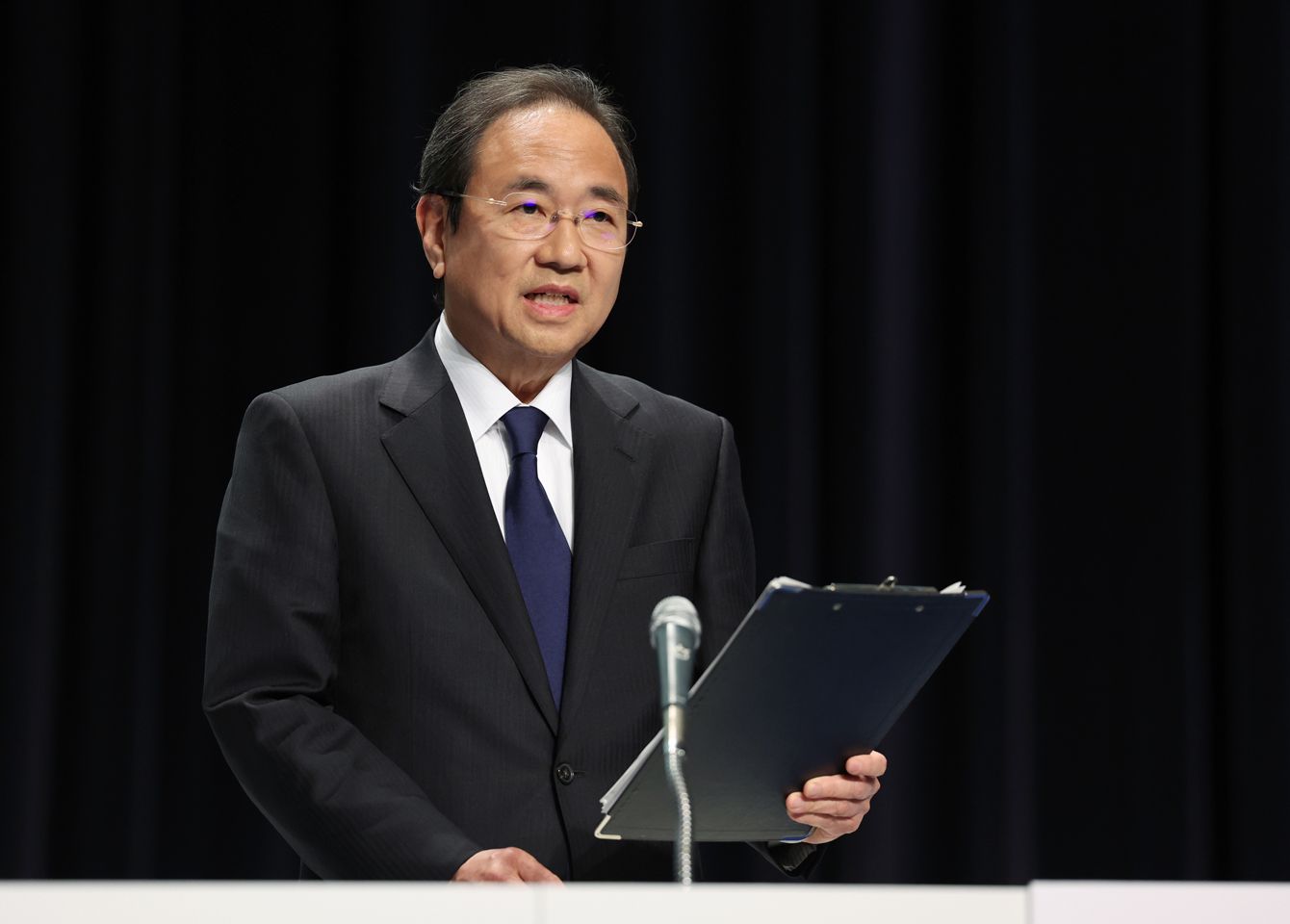第三者委員会の調査結果公表を受け、記者会見するフジテレビの清水賢治社長=2025年3月31日、東京都港区