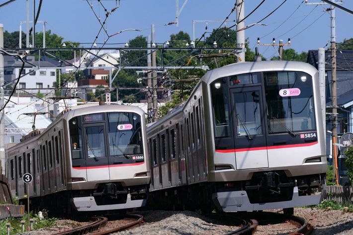 東急東横線の菊名―妙蓮寺間で離合する5050系電車(写真=MaedaAkihiko/CC-BY-SA-4.0/