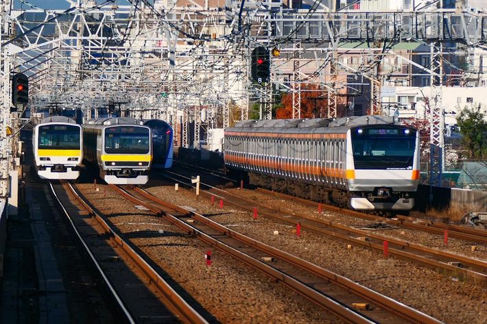 京葉線の新木場駅付近で離合するJR東日本E233系5000番台(各駅停車)および209系500番台(快速)(写真=MaedaAkihiko/CC-BY-SA-4.0/