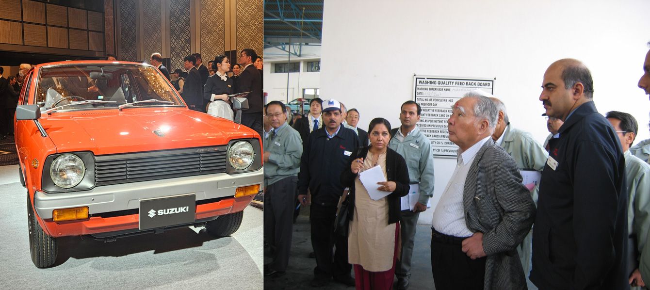 左写真:初代アルトは商用車ベースで売り出された 右写真:インド・マネサール工場を視察する鈴木修氏