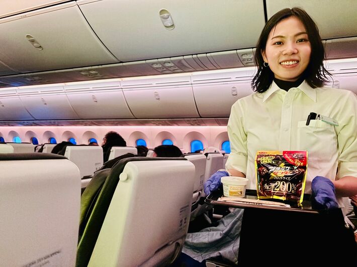 客室乗務員のBEBEさん(バッジネーム)が機内でオーダーできるブラックサンダーとアイスクリームを席まで届けてくれた