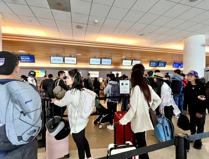 筆者がサンノゼ発成田行きに乗った際のカウンターの様子。多くの旅行者で混雑していた=2023年6月、米サンノゼ国際空港