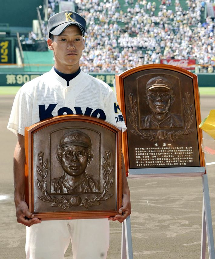 故嶋清一さんの野球殿堂入りの表彰式で、記念のレリーフを持つ向陽高野球部の加森禎人主将=2008年8月15日午前、甲子園球場