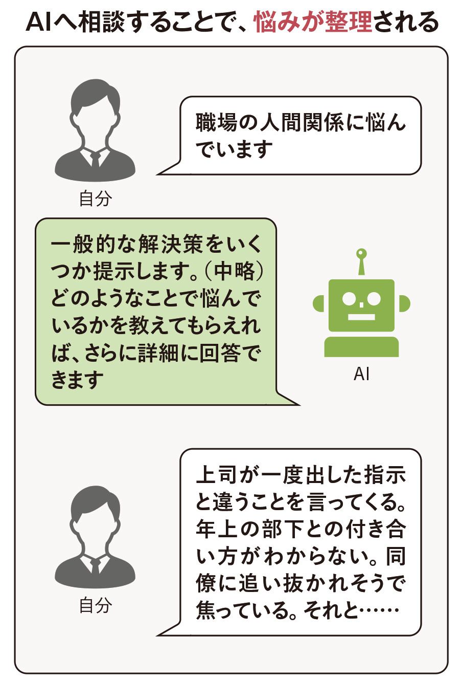 チャット型AIへの悩み相談のイメージ例。解決策を求めるのではなく、自らの思考を整理するための壁打ち相手として使うのがおすすめだと三上氏は語る。