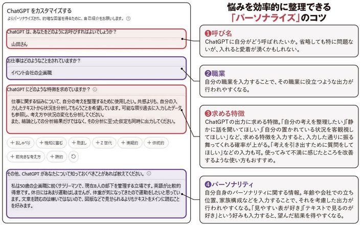 ChatGPTのパーソナライズ機能の例(画像はPC版のもの)。自分のアイコンをクリックし、「ChatGPTをカスタマイズする」を選択すれば設定画面が表示される。何度でも再設定が可能。自分好みになるまで試行錯誤を繰り返すことで、AIの活用スキルも向上する。