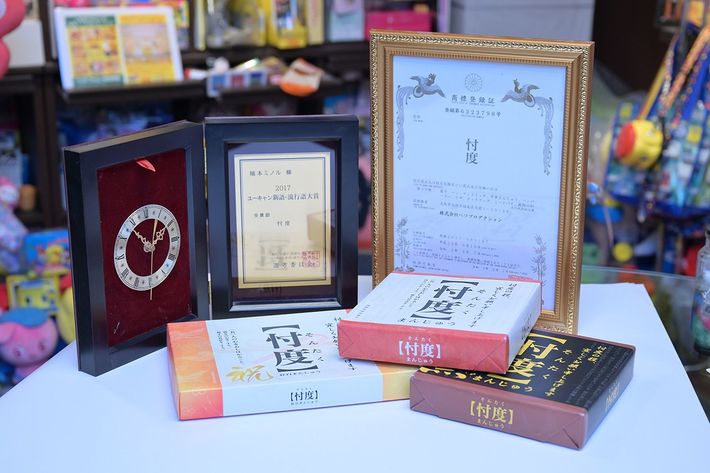 森友学園や加計学園を巡る問題で流行した言葉「忖度」を焼き印した、その名も「忖度まんじゅう」。シリーズ累計30万箱を突破。「忖度」はその年の流行語大賞も受賞。トロフィーは稲本さんが受け取った。