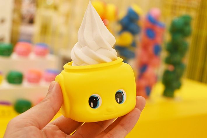 フエキノリの容器に入れるソフトクリーム。ショップ内限定、自分でソフトクリームを入れるスタイルだ。フレーバーは、バニラ、チョコ、イチゴなど8種類。