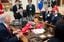 関税交渉のため訪米した赤澤経済再生大臣(右)と、トランプ米大統領(左)。同氏に贈呈された「金色のミャクミャク貯金箱」が中央に。(2025年4月16日、米国、ワシントン、ホワイトハウス)