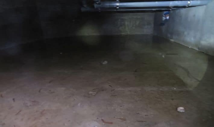 地下ピットを一面、水が覆っている。1階住民を長年悩ませたカビの原因とわかった