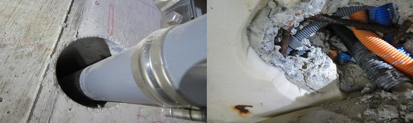 (写真左)地中梁の「コア抜き」によって配管が通されたが、穴の中の鉄筋が切断されてしまった/(写真右)複数の配管や鉄筋がこんがらがり、一部の配管が塞がれていた