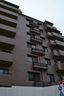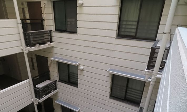 マンションの壁。一番上の窓の下側には本来、縦の「耐震スリット」が入っていなければならない