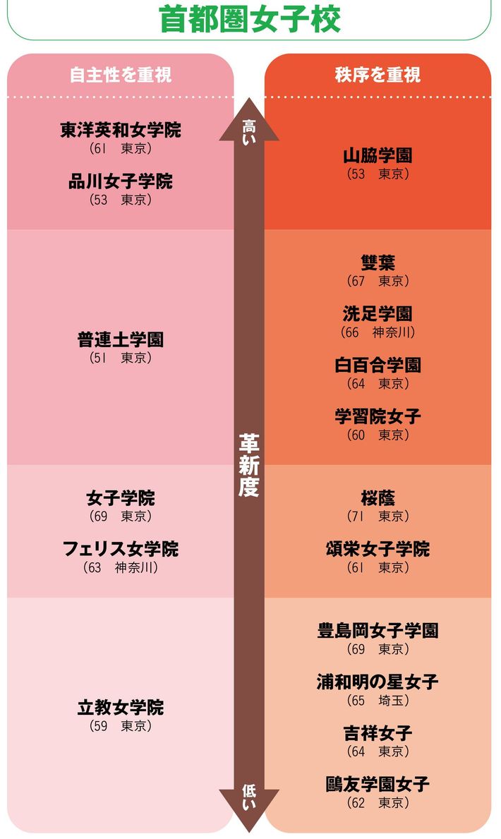 ※()内は偏差値と所在地。首都圏の学校は四谷大塚の2025年入試の予想偏差値。()内に数字が2つある場合は(男/女)。※同カテゴリー内の記載順と革新度の高低に関係はない。(安浪京子、吉田玲唲=表作成)