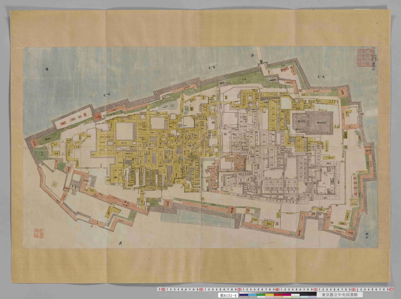 右側の白い部分が大奥で、左の黄色の部分は政務を司る場所だ。(画像=「江戸城御本丸御表御中奥御大奥総絵図」東京都立図書館蔵)