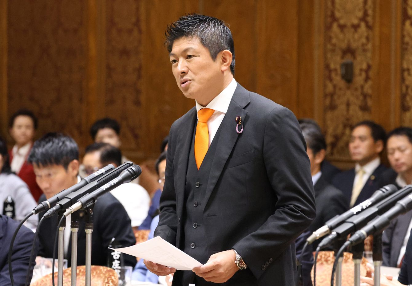参院予算委員会で質問に立つ参政党の神谷宗幣代表=2025年8月5日