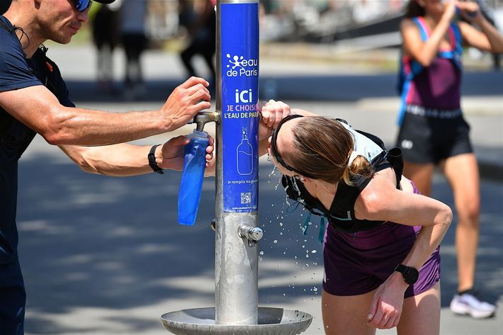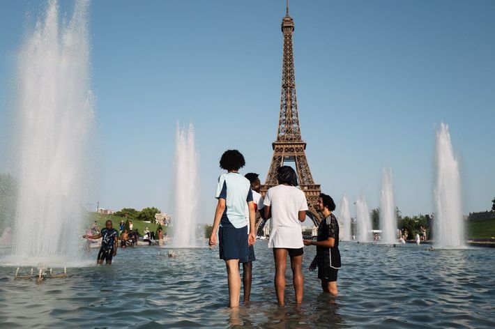 2025年7月1日、フランス、パリのトロカデロ庭園内にある噴水で涼むパリジャンと観光客。フランス気象局(メテオ・フランス)によると、フランスの気温は今日がピークとなり、一部の地域では摂氏40度を超えると予想されている。