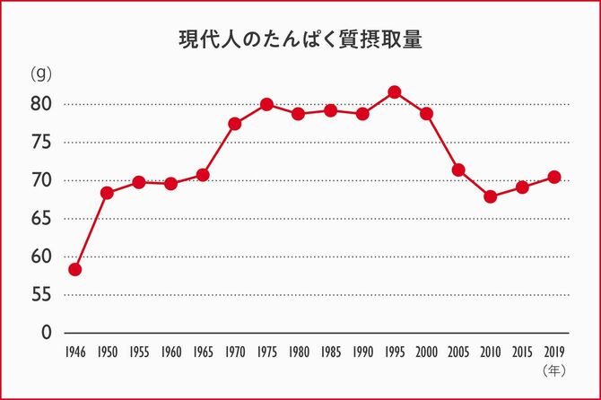 厚生労働省の国民健康・栄養調査によると、2010年に日本人のたんぱく質摂取量は70gを切った。これは戦争終結から5年後の1950年よりも低い数値となっている。なぜ、日本人はたんぱく質を摂らなくなったのか。
